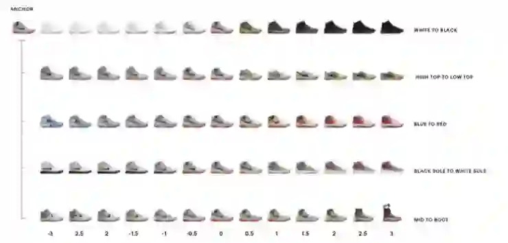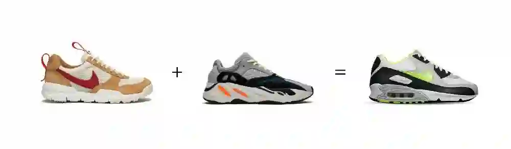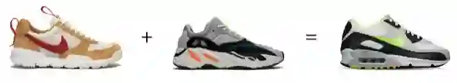 从逻辑上讲,如果每个运动鞋只是潜在因素的集合,则可以相对于彼此相加或相减这些因子。这是一个将两个运动鞋加在一起的例子。注意结果是如何保持第一个运动鞋的宽踝环和品牌标识,且唯一的整体轮廓和材料属于第二个。