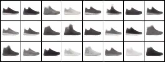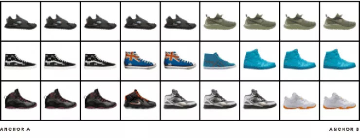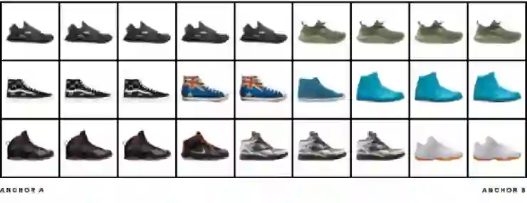 为了展示学习过的流形并检查学习曲面的平滑度,我们可以通过插值进一步可视化。我们选择两个看似不同的运动鞋作为锚点,然后在潜在的空间中判断它们之间的过渡。沿插值的每个潜在向量被解码回图像空间以进行视觉上的检查,并与我们整个目录中最接近的实际产品相匹配。下面的动画说明了这些概念以映射模型怎样学习。