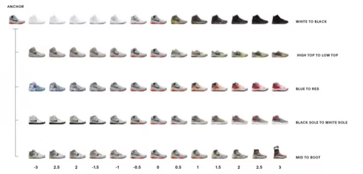 该模型倾向于在每个维度中创建更多独立的人类可解释因子,称为解构。首先,该模型着重于重新创建最合适的轮廓,同时注意鞋底和鞋面之间的对比。从那里开始,它构建了整个轮廓的灰度渐变概念,直到它开始学习基本颜色。在了解轮廓类型后,例如启动与运动,高与低后,网络开始解决更复杂的设计模式和颜色,这将是最终的差异化因素。