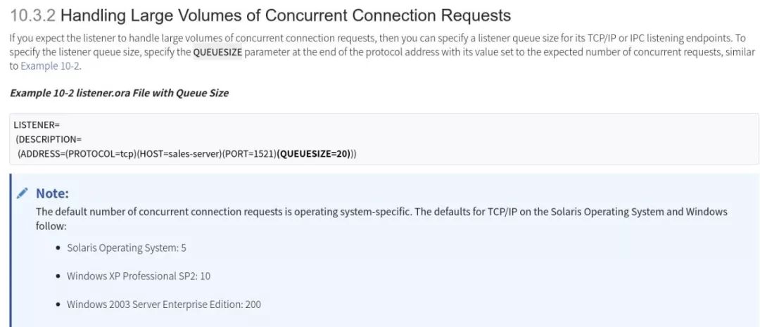 第二种是在监听中增加QUEUESIZE参数,QUEUESIZE参数是指监听器在建立连接时可以存储的并发连接请求数。如果传入请求数超过缓冲区大小,则请求连接的客户端将接收失败。在比较理想的情况下,此缓冲区大小应该等于或者大于预期并发请求的最大数量。Oracle官方文档也提到了这个参数适用于处理大量并发连接的请求。