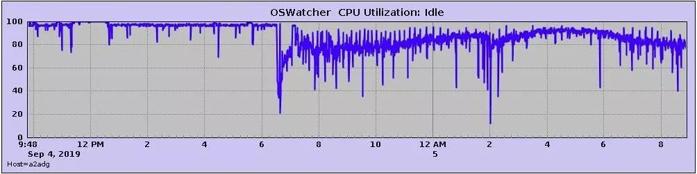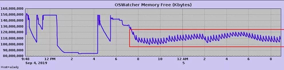 正常运行的Oracle软件不会出现这么多trace,于是怀疑是Oracle 11gR2软件和Centos 7.5版本存在兼容性问题(主库是Centos 6和Oracle 11g),通过使用另外的一套机器RedHat6搭建了一套新的11g adg环境后,彻底解决了半夜宕机的问题。通过OSWatch可以发现内存的波动是相对稳定的。