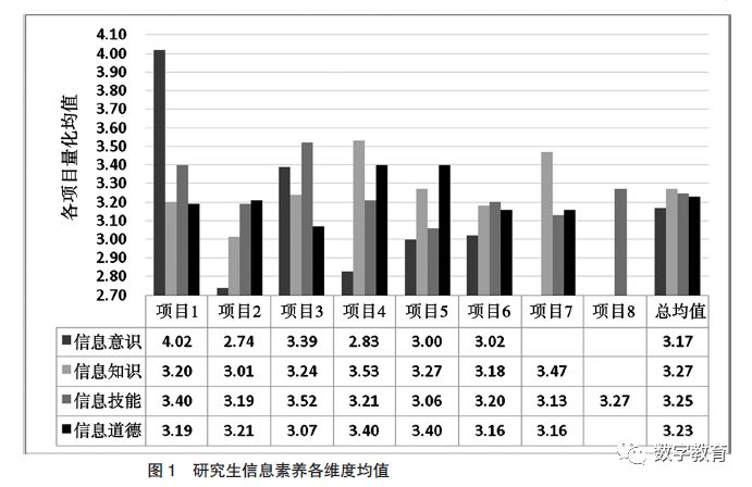 由图1 可知,信息意识的量化总均值为3.17,其中项目1 量化均值较良好,项目2 和项目4 的量化均值相对较低,说明虽然大部分研究生都能较好地意识到信息素养是研究生阶段的必备能力,但对信息的捕捉能力和专业动态的关注度有待加强。信息知识的量化总均值为3.27,信息技能的量化总均值为3.25,信息道德的量化总均值为3.23,各项目间的量化均值差异较小,说明虽然当前研究生对信息知识、信息技能和信息道德基本能把握,但把握程度较为一般。研究生信息素养的总量化均值为3.23,说明当前研究生信息素养的整体状况较为一般,研究生信息素养教育的成效确实不理想,有较大的提升空间。