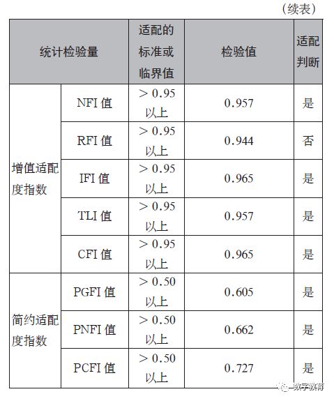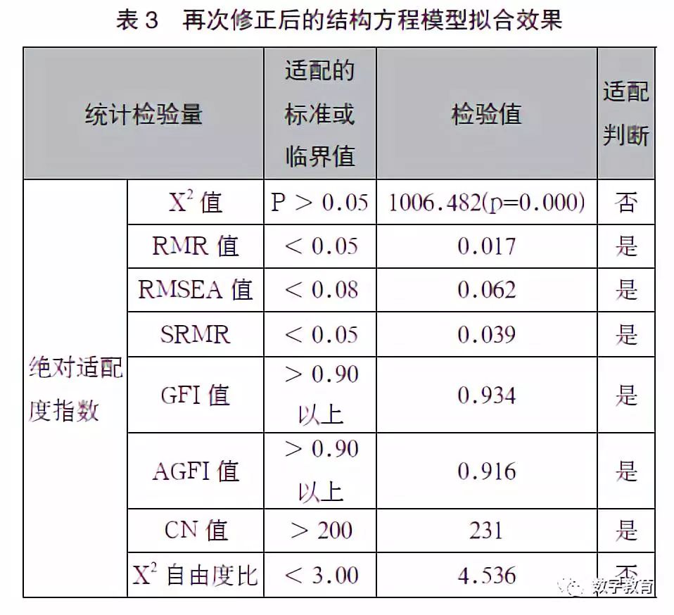 对再次修正后的结构方程模型拟合效果如表3 所示。此时,结构方程的拟合效果的检验值,只有X2 值、X2 自由度比和RFI 值3 项未达到参考的适配标准[14], 模型已基本符合适配标准,整体拟合度较前两次有了较好的改善,也更加具有指导意义。因此,将此模型确定为最终的结构方程模型。