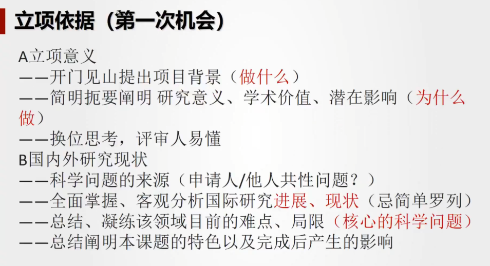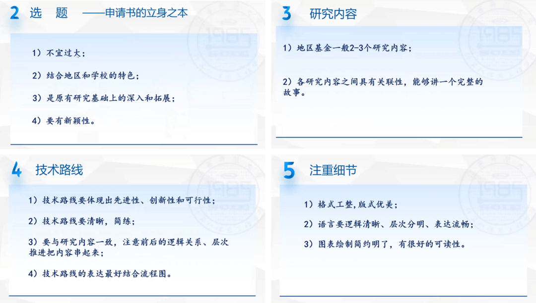 鄢博士通过结合自身经验和专家指导,介绍了申请地区科学基金项目的注意要点,主要包括以下方面:立项依据、选题、研究内容、技术路线和注意细节。此外,鄢博士也提醒了请同行专家帮助评阅的重要性。