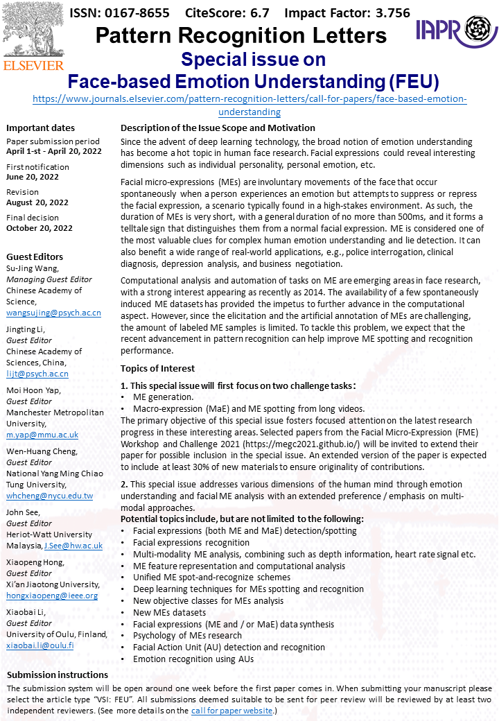 在活动的最后,讲座的主持人李婧婷博士对活动进行了总结并对第二十五期CSIG云上微表情活动进行了预告,敬请继续关注!此外,王甦菁博士等人在Pattern Recognition Letters申请了主题为“Face-based Emotion Understanding”的专刊,欢迎大家关注!