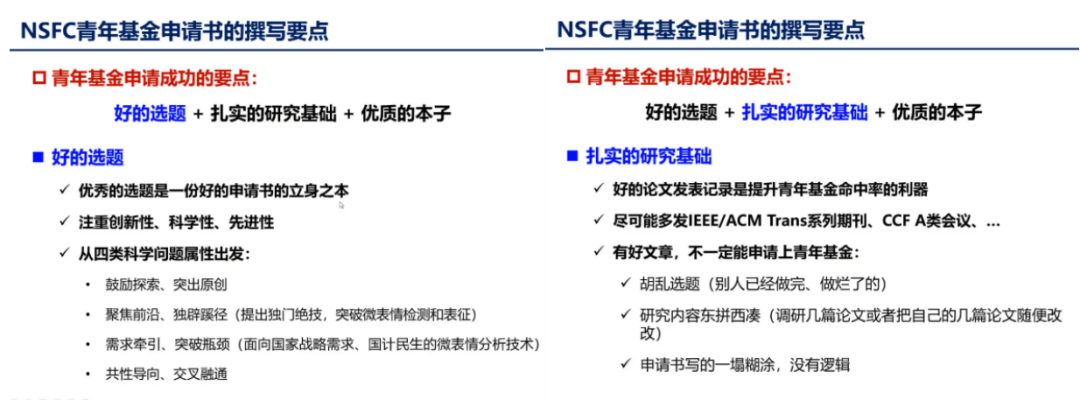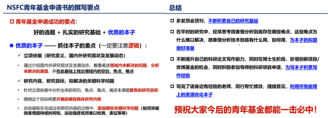 其次,宗博士介绍了国自然青年基金申请书的撰写要点,即:好的选题+扎实的研究基础+优质的本子。