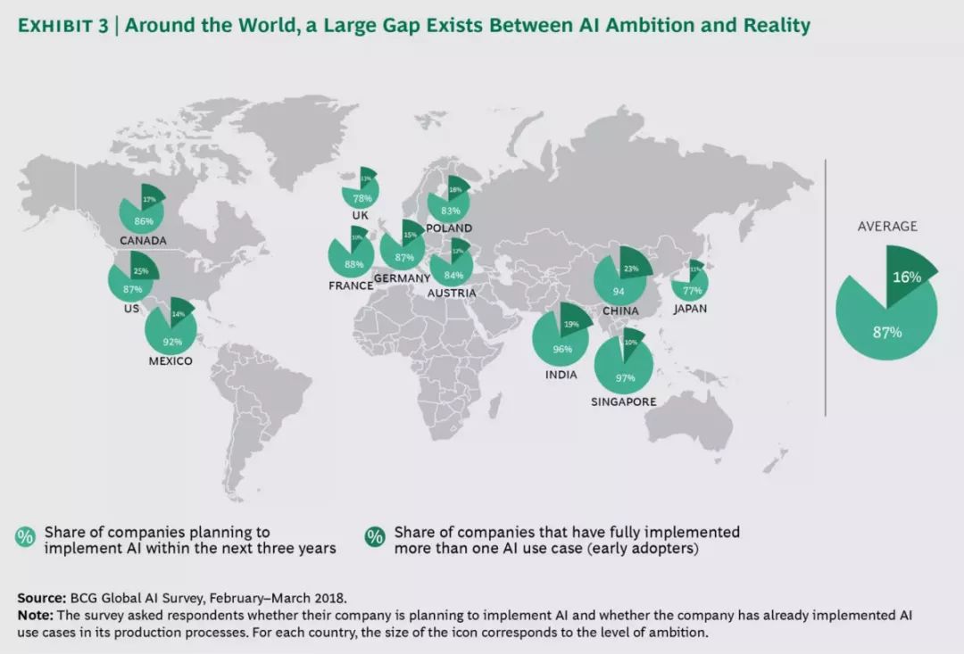 参与我们研究的大多数公司都说他们注意到 AI 的重要性正在增强。然而,他们的投资、话以及实施都没法跟他们的野心相称。