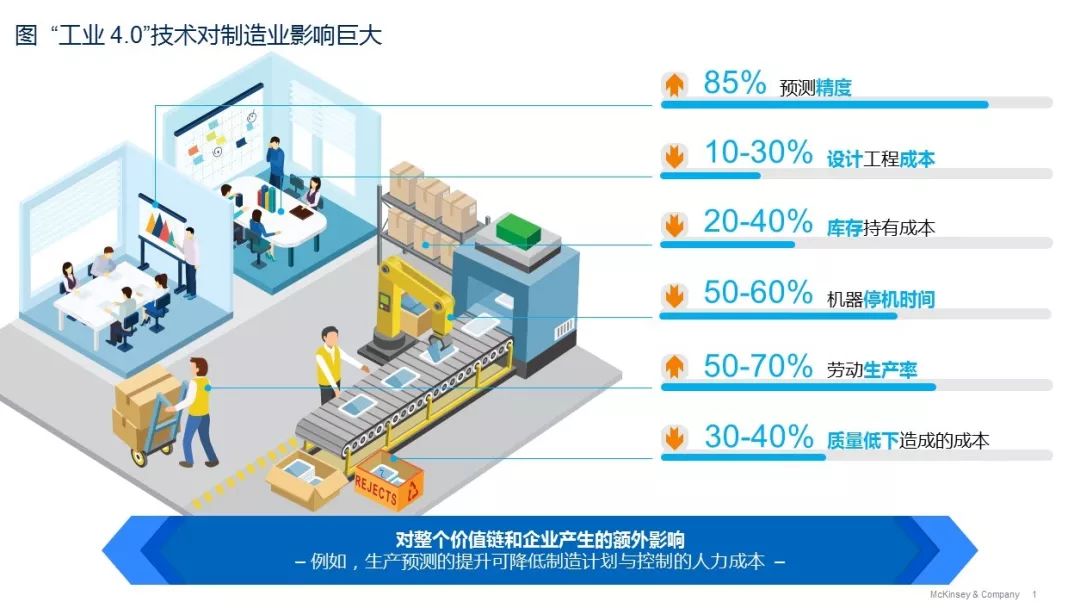 这些未来工厂将拥有海量数据,使用强大而新颖的分析工具挖掘数十亿数据点,释放人工智能和机器学习的潜力。结果如何?我们预计:生产线效率取得的突破将促使产出几乎翻番;更加严格的绩效管理可以将质量问题减少一半;而先进的预见性维护则能大幅缩短机器停机时间。