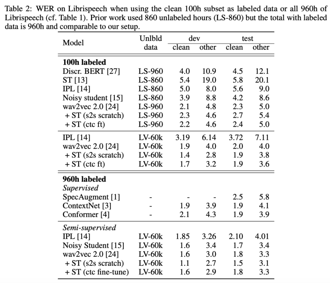 至于自训练,研究人员使用基于不同标注数据设置微调过的 wav2vec 2.0 LARGE 模型对 LS-960 或 LV-60k 音频数据执行伪标注。