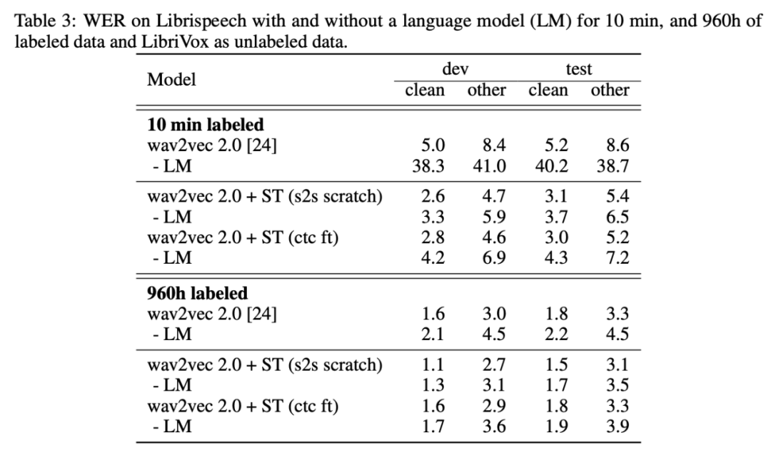 下表 3 展示了,在没有语言模型的情况下,自训练和预训练的结合仍能取得不错的性能。这是因为伪标注过程中使用的语言模型已被部分融入伪标注数据中。在没有语言模型的 10 min labeled 设置下这一效应尤其显著:在 test-other 数据集上,wav2vec 2.0 + ST (s2s scratch) 将基线方法 (wav2vec 2.0 - LM) 的词错率降低了 83%。