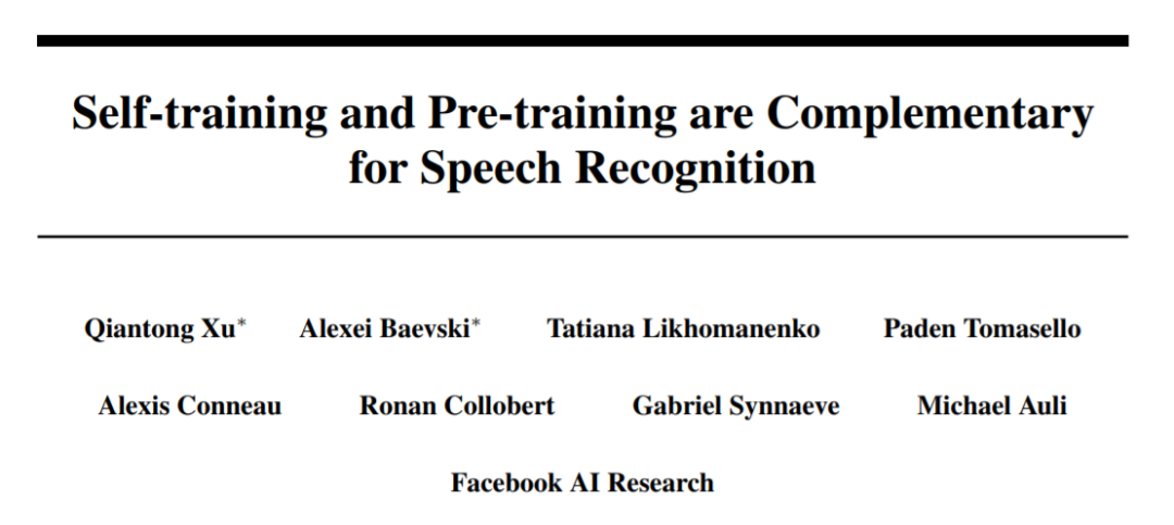 Facebook 这篇论文将自训练和无监督预训练结合起来。这两种利用无标注数据的方法在基准上都取得了不错的结果,该研究想要解决的核心问题是它们能否互补。具体而言,该研究基于最近提出的 wav2vec 2.0 模型与 Kahn et al. (2020; [13]) 和 Xu et al. (2020; [14]) 提出的自训练方法进行,探索了从头开始基于伪标注数据训练模型,以及对预训练模型进行微调。为了更好地了解这两种方法的互补性,研究人员使用了相同的无标注数据。