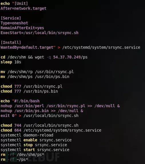 这个satan脚本首先会创建一个名为srsync的系统服务文件,然后自动运行。srsync服务会调用脚本/usr/local/bin/srsync.sh,而srsync.sh脚本会运行rsync.pl在这个perl脚本以及ps.bin代码文件。rsync.pl脚本来自于/dev/shm/rp,会跟.satan脚本一起从服务器传送过来,并使用wget命令获取ps.bin代码文件(来自于主机54.37.70[.]249)。需要注意的是,在恶意挖矿软件中,攻击者使用了crul作为wget的备用命令,
