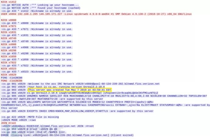这是标准的IRC流量,客户端会持续获取用户名,成功之后便会加入一个##root信道,而且服务器端还是2019年5月7日创建的。