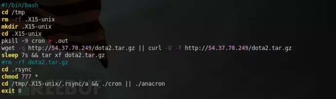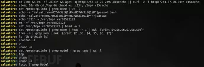 首先,攻击者通过HTTP向主机54.37.70[.]249请求了一个名为.x15cache的文件,然后在等待了10秒钟之后执行了该文件。除此之外,攻击者还将用户密码修改为了一个随机字符串。.x15cache文件的内容如下:
