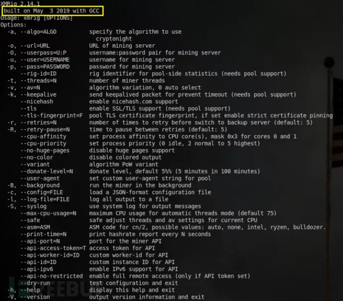 上图为xmrig命令的帮助页面,而它是一款针对门罗币的CPU挖矿软件。除此之外,我们还捕捉到了编译时间信息:2019年5月3日,也就是上个月。