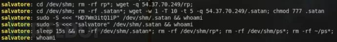 这一次,攻击者的操作目录为/dev/shm,并从之前的主机54.37.70[.]249获取rp和.satan这两个文件,。接下来,攻击者会尝试运行sudo命令来获取root权限,然后以root权限感染.satan脚本。.satan文件内容如下: