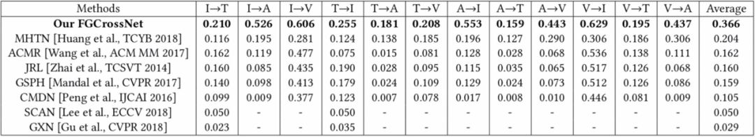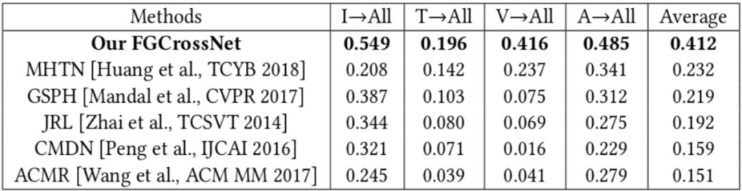 表 1:本文方法和现有方法在双模态细粒度跨媒体检索任务上的检索准确率(MAP)。