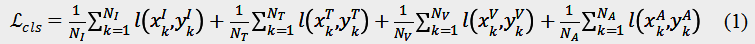是交叉损失函数,I,T,V,A 分别表示图像、文本、视频和音频。