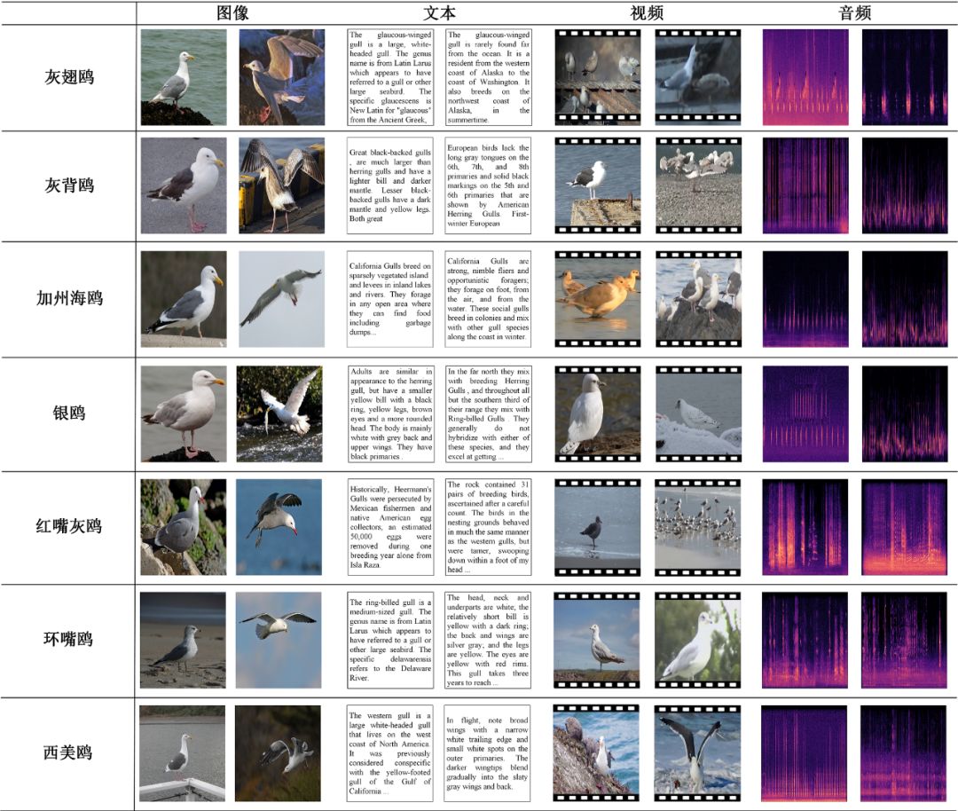 图 2:PKU FG-XMedia 数据集中的样例,如图展示了 7 种细粒度类别的图像、文本、视频和音频数据,其中音频数据用声谱图可视化。
