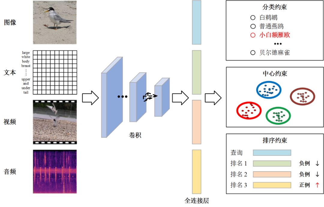 类间差异小,类内差异大:这是细粒度分类面临的挑战。其中,类间差异小是指不同的细粒度类别具有相似的外表(图像、视频)、描述(文本)和声音(音频);类内差异大是指由于视角、光照、描述、背景等不同,相同的细粒度类别又存在外表、描述和声音差异大的现象。上述问题导致难以准确检索特定细粒度类别的媒体数据,相比粗粒度跨媒体检索更具挑战。