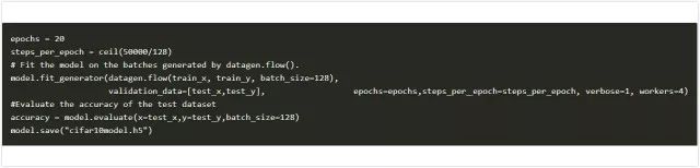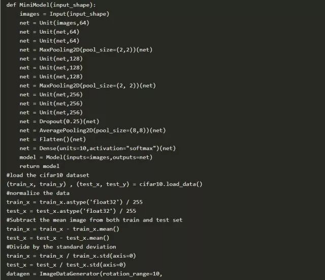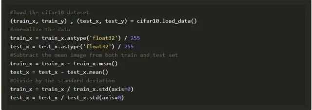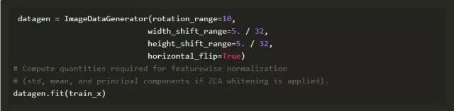 在上面的代码中,加载训练和测试数据后,我们从每幅图像中减去平均图像并除以标准偏差,这是一种基本的数据增加技术。对于更先进的数据增强,我们的图像加载过程会略有改变,Keras有一个非常有用的数据增强程序,可以简化整个过程。