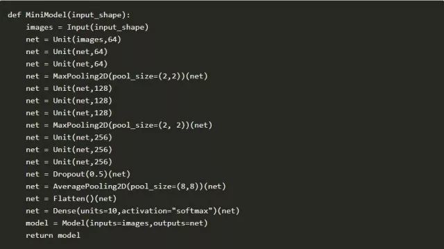 在这里,我们使用功能性API来定义我们的模型,我们从三个单元格开始,每个单元格有64个过滤器,后面是一个Max Pooling layer,将32*32图像缩小到16*16。接下来是3128个过滤器单元,然后是Pooling,在这里,我们的图像变成8*8。最后,我们有另外3个单元,256通道。请注意,每当我们将图像尺寸缩小2倍时,我们将通道数增加一倍。