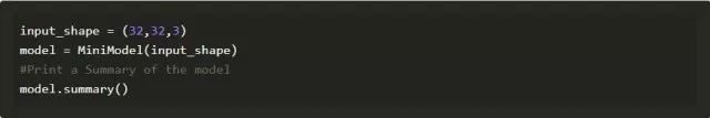 下一行创建我们定义的模型的实例,并传入输入形状,最后一行将打印出我们网络的完整摘要,包括参数的数量。