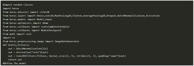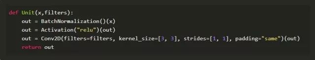 这里是我们的代码最重要的方面,单元函数定义了一个简单的图层,其中包含三个层次,第一个是我先前解释的Batch Normalization,接下来我们添加RELU激活,最后添加卷积,注意我是怎样用“预激活”的方式把RELU放在conv之前的。