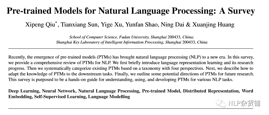 论文标题:Pre-trained Models for Natural Language Processing: A Survey 论文链接:https://arxiv.org/pdf/2003.08271.pdf