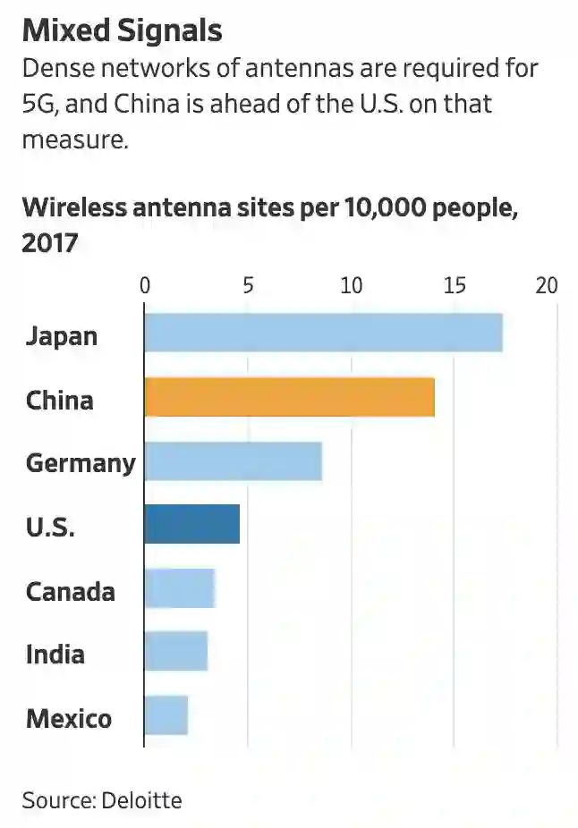 平均下来,中国每万人拥有14.1座基站,美国则是每万人拥有4.7座基站。