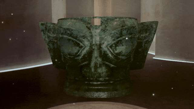 游览完了黄山,他又到了三星堆博物馆,通过手势互动「把玩」了三星堆青铜面具。