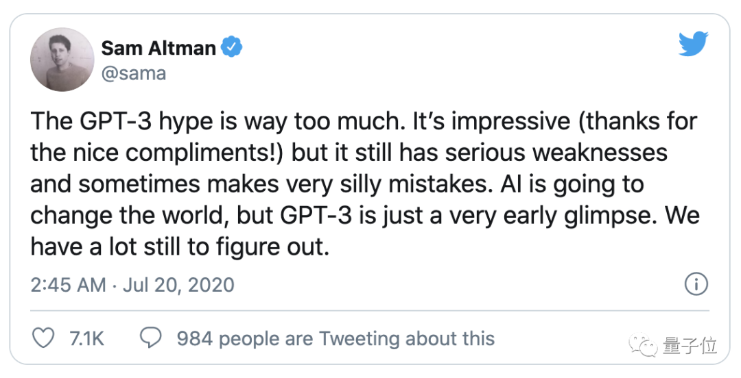 的确,疯狂的鼓吹情绪变得如此强烈,以至于OpenAI CEO本人都发Twitter说:GPT-3被过度宣传了。