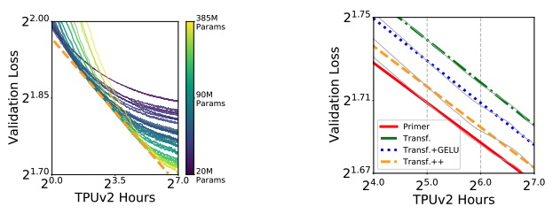 上图又进一步展示了Primer在所有模型规模下的实验数字。横轴是时间,纵轴是验证集上的损失,不同颜色的曲线代表不同的模型规模。左图是对所有Transformer变种用MSE实验去拟合出达到给定精度的最佳模型大小,绘制成二维线图,也就是scaling law[4]曲线。可以看到Primer的scaling曲线在最下方,这意味着在所有模型大小情况下,Primer都能更快地达到指定学习精度。