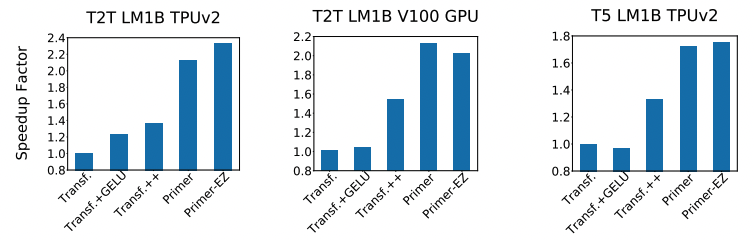 上图绘制了35M参数模型的实验结果,以标准Transformer模型训练24小时的学习效果为基准,横轴是几种Transformer模型变种,纵轴是各个变种达到基准效果的加速比,从中可以看到Primer在所有实验组中都有1.7倍以上的加速率。