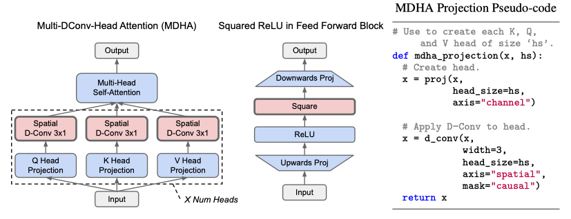 Primer 对Transformer的结构给出了两处修改,在下图中用红色圈出。在论文进行的各项实证研究中,这两项修改最为鲁棒。论文作者建议:Transformer语言模型的使用者如果想尝试改进自己的模型,推荐从这两项修改开始。