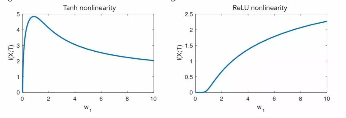 使用 tanh 非线性函数,互信息先增后降。使用 ReLU 非线性函数,互信息一直呈上升趋势。