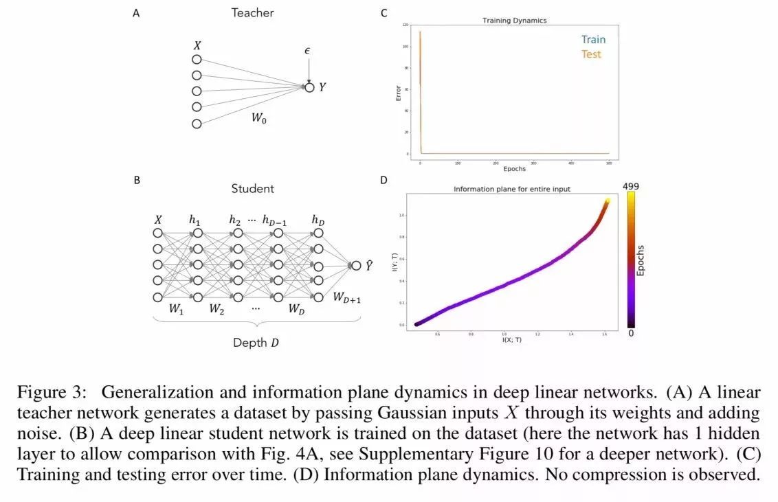 ……我们利用 student-teacher 设置(Seung et al.,1992;Advani & Saxe, 2017)下训练的简单线性网络探索泛化动态的最近结果。该设置可以让我们较精确地计算网络泛化性能和表征的互信息(未经分箱),以及直接对比线性高斯问题已知的信息瓶颈边界。