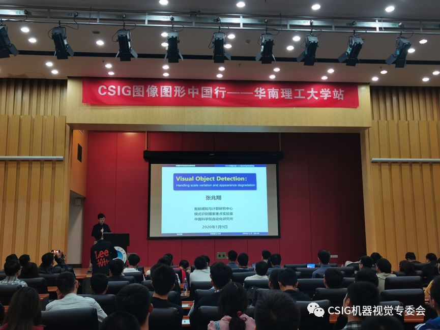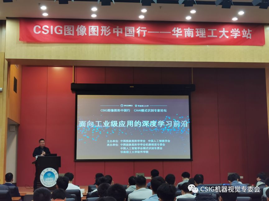2020年01月09日,历时一天的“CSIG图像图形中国行”和“CAAI模式识别专家论坛”在华南理工大学大学城校区完满落幕。本次论坛由中国图象图形学学会(CSIG)和中国人工智能学会(CAAI)主办,由中国图象图形学学会机器视觉专委会、中国人工智能学会模式识别专委会和华南理工大学软件学院共同承办。论坛主题为“面向工业级应用的深度学习前沿”,旨在推动模式识别、深度学习以及图像图形学科的普及,加深同学对前沿热点和发展现状的了解,激发科研热情,增加与顶尖学者间的学术交流,并促进高校与企业之间的合作与交流。来自广州、北京和香港各大高校的近300名学生和老师、以及30多名来自各大企业和科研机构的研究人员参与了本次论坛。