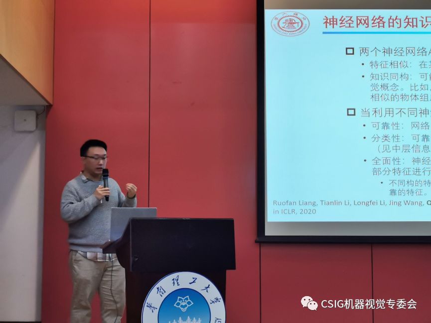 张拳石副教授作了题为“Deep Learning: Interpretability, Capacity, and Evaluation”的特邀报告。张博士围绕深度学习的可解释性展开了讨论:强调定量、严格地解释神经网络在实际应用和理论研究中的必要性。他指明两个主要研究方向——从语义层面解释、和从数学层面上建模神经网络潜在的表达能力。张博士进一步从如下三个方面介绍了深度学习的可解释性:首先,他从语义层面解释神经网络,讲述了用层次化的图模型解释神经网络内部表达的方法,阐述了如何端到端地学习到能被人理解的神经网络特征,具体地介绍了一个神经网络的解释过程。随后,张博士分析了层间传递在神经网络中的效果,量化地研究了神经网络的表达能力。他指出神经网络会遗忘更多的背景信息而保留更多前景信息,阐述了神经网络信息的可靠性和知识表达的一致性,介绍了神经网络的知识同构。最后,张博士讲述了如何对可解释性进行评估,强调要客观性地评价神经网络的结果。通过与张博士热烈讨论,同学们加深了对神经网络可解释性的认识。