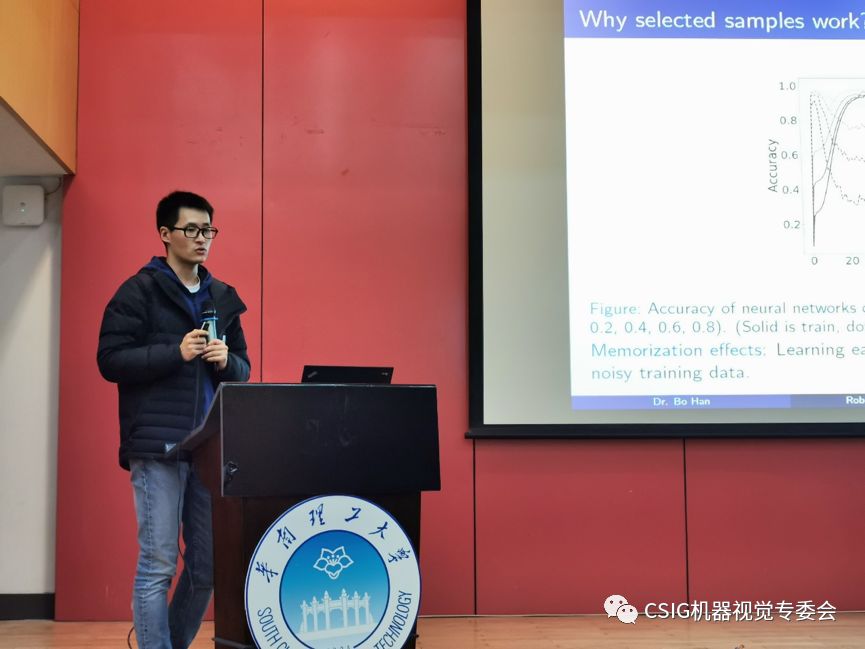 下午,来自香港浸会大学的韩波教授进行了题为“Robust Deep Learning with Noisy Labels”的学术报告。在报告的开始,韩教授介绍了现实场景所采集的数据普遍带有噪声的问题,解释了Robust Deep Learning研究的重要性。之后,他分别从数据和训练两个角度介绍了Robust Deep Learning with Noisy Labels的背景知识,进一步提出该任务所面对的主要挑战是正确估计噪声矩阵的问题。针对这个挑战,韩教授提出了基于Masking和Co-teaching的研究思路。在报告的最后,韩教授介绍了Robust Deep Learning with Noisy Labels在医疗领域的应用前景,他的报告层层深入,引发会场学员们的思考。报告结束后,韩教授和现场的老师、同学们热烈讨论,引发了一场精彩的思维碰撞。
