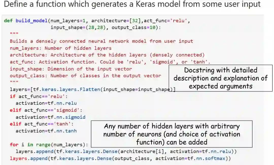 我们将 Keras 的模型构造代码封装在一个实用函数中,从而使得任意层数架构的模型(只要它们是密集连接的)都可以通过简单的用户接口传递函数参数来生成。