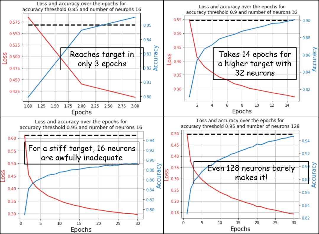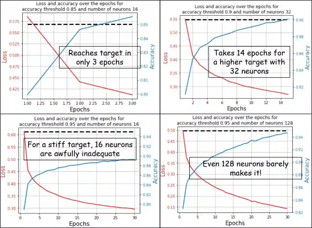 另外,请注意每个图表的自定义标题。这些标题清楚地阐明了目标性能和神经网络的复杂度,从而使分析变得容易。