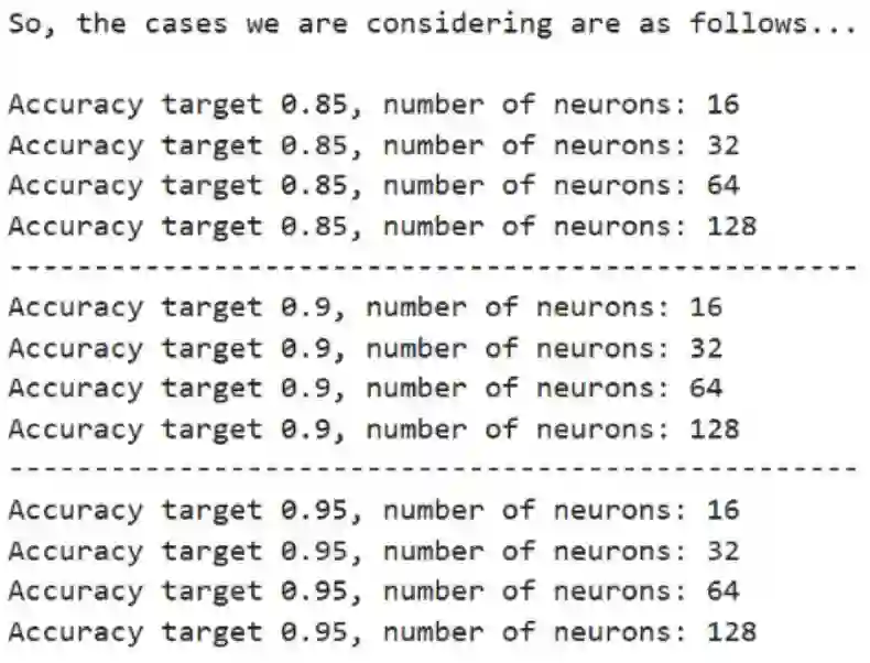 from itertools import productaccuracy_desired = [0.85,0.9,0.95]num_neurons = [16,32,64,128]cases = list(product(accuracy_desired,num_neurons))print("So, the cases we are considering are as follows...\n")for i,c in enumerate(cases):print("Accuracy target {}, number of neurons: {}".format(c[0],c[1]))if (i+1)%4==0 and (i+1)!=len(cases):print("-"*50)