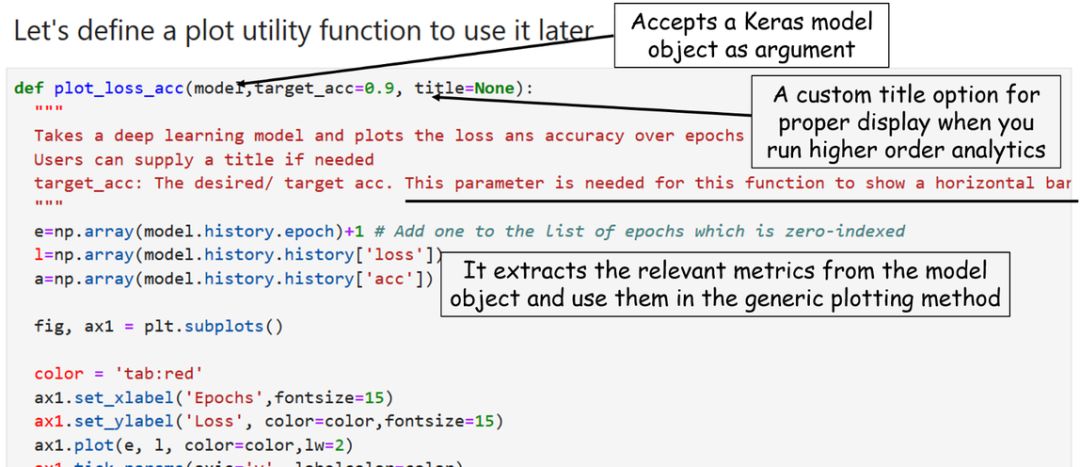 接下来,我们将编写可视化代码,同样地,我们通过函数化实现该功能。通用绘图函数将原始数据作为输入。然而,如果我们有这样一个特殊目的——绘制出训练集上准确率的演化情况并且显示出其与目标准确率的对比,那么我们的绘图函数只需要将深度学习模型作为输入,然后绘制目标图形。