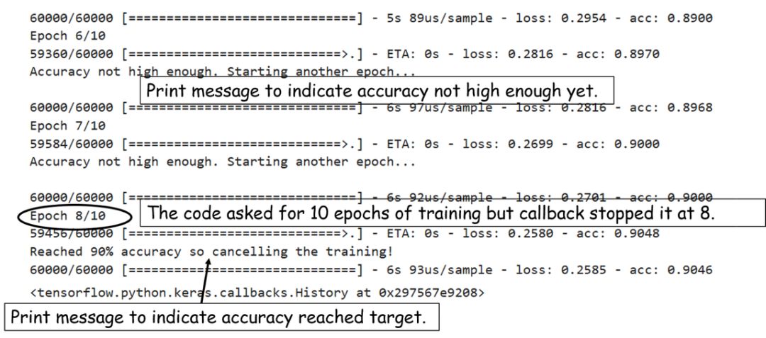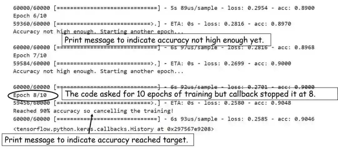 这个简单的回调函数可以动态控制 epoch——当准确率达到指定阈值后训练自动停止。