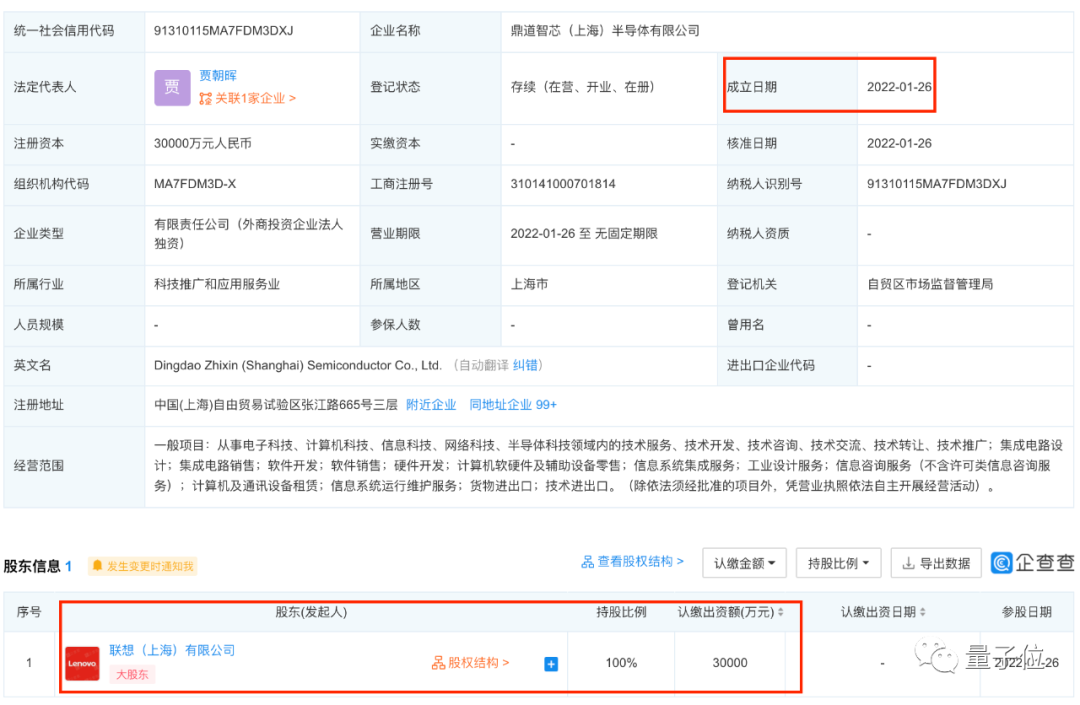 由联想100%控股,名为鼎道智芯(上海)半导体有限公司现已正式成立: