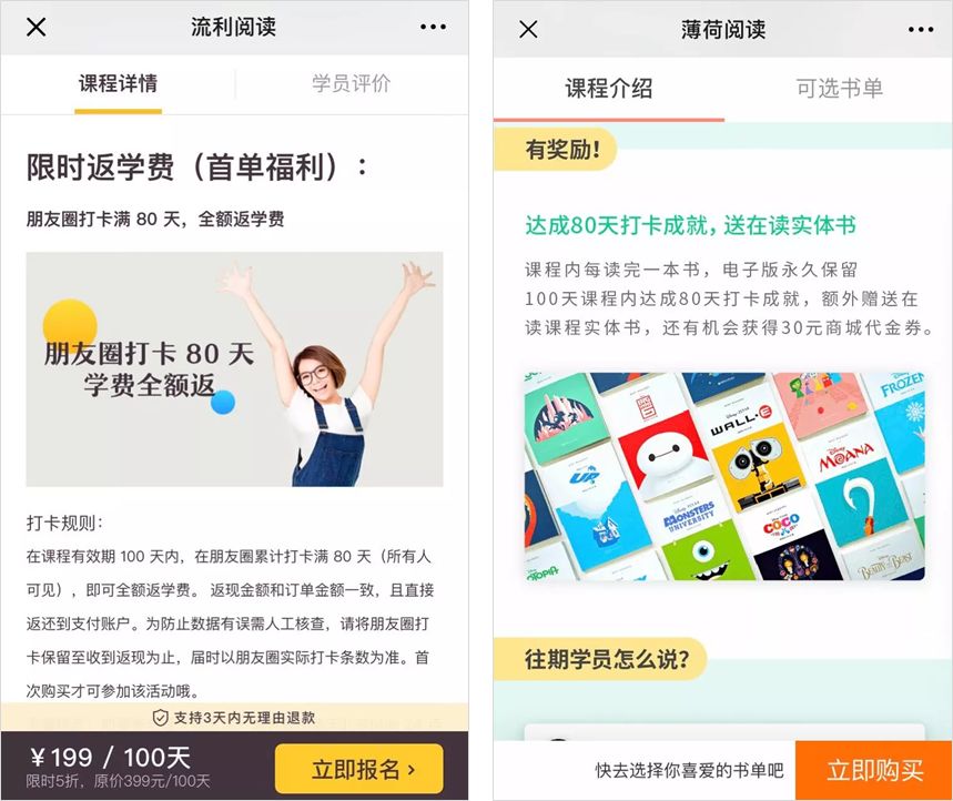 目前这类产品的利益诱导主要有两种模式,一种是以流利阅读为代表的“坚持打卡返学费”模式,一种是以薄荷阅读为代表的“坚持打卡送优惠券”模式。