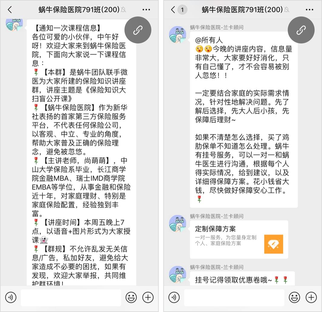 以蜗牛保险为例,它通过大量投放软文戳中用户需求,以免费讲座吸引用户加入社群,在社群中用优质内容获取用户信任后,再对用户进行转化。这种模式的蜗牛保险现估值已经超过 1 亿美元。