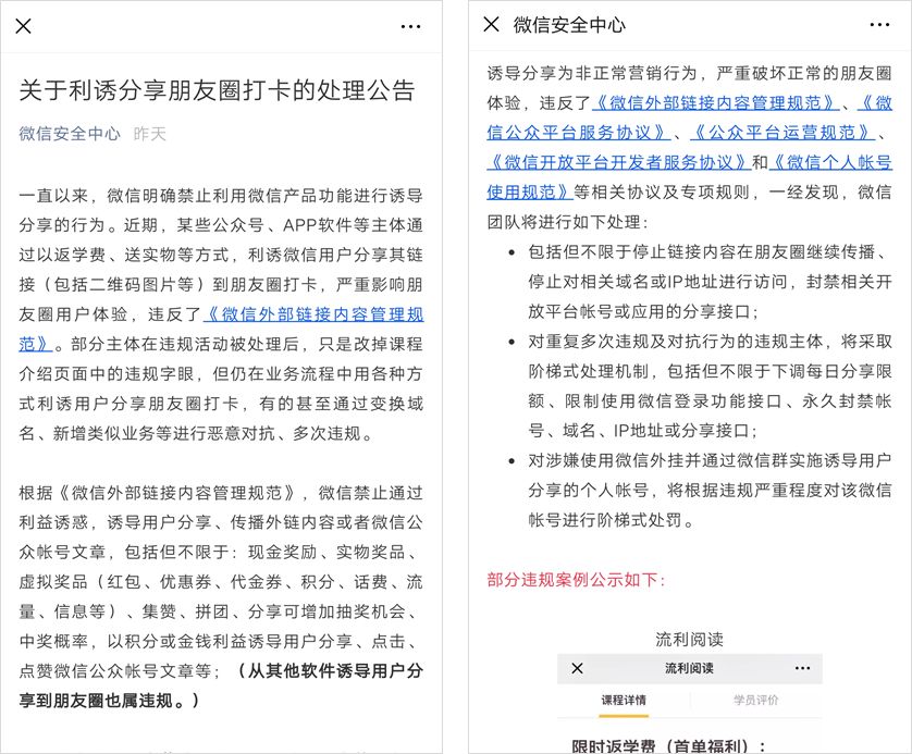 因为微信爸爸发布了《关于利诱分享朋友圈打卡的处理公告》,强调要严惩诱导分享行为。这些诱导分享行为包括但不限于通过以返学费、送实物等方式,利诱微信用户分享其链接(包括二维码图片等)到朋友圈打卡。