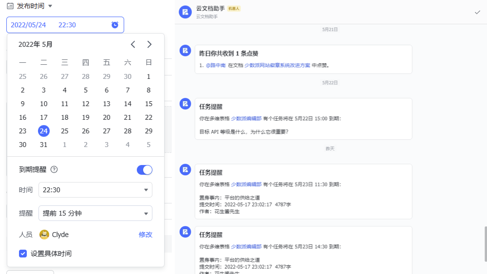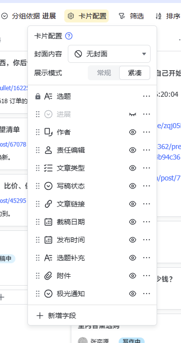 配合恰当的卡片配置,编辑们在无需点开卡片详情的情况下就能快速获取到每个选题及稿件的当前情况,遇到需要新增的字段类型时,也可以非常方便地直接在卡片配置中进行添加;遇到需要分配给特定成员完成的任务,只需要通过「人员」字段类型和细致的提醒设置功能,便能将看板与飞书直接关联起来,整套体验都不会跳出飞书之外。